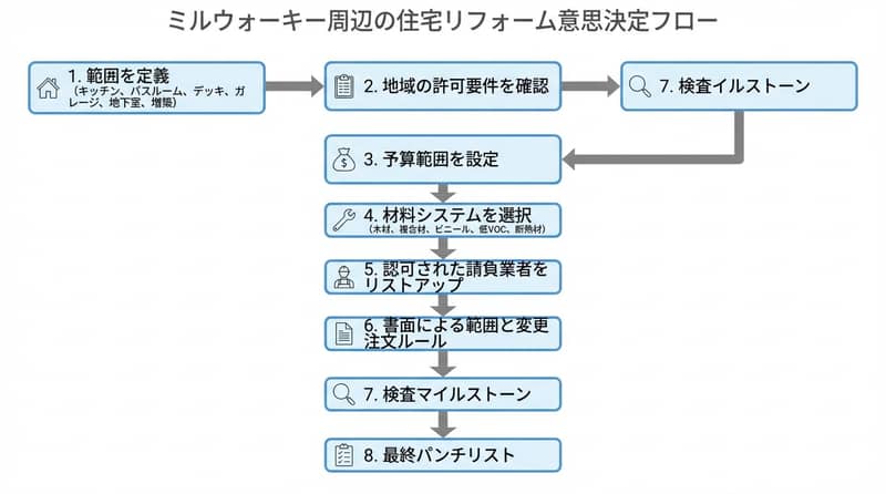 ミルウォーキー周辺で満足度が高い改装は、キッチン・浴室・デッキ・ガレージ・地下室・増築の6つを「許可と素材と職人の当たり外れ」で管理すると失敗が減る。